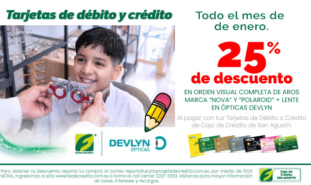 - Descuento válido todo el mes de enero de 2026 al pagar con las Tarjetas de Débito y Crédito del SISTEMA FEDECRÉDITO en ópticas Devlyn.