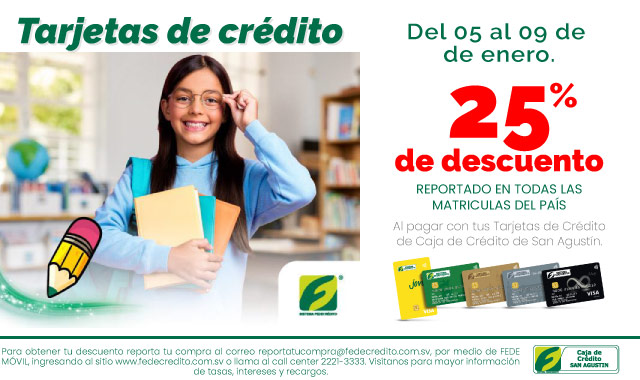 25% de descuento reportado en todas las MATRICULAS DEL PAÍS del 5 al 9 de enero de 2026, al pagar con tus Tarjetas de Crédito del SISTEMA FEDECRÉDITO